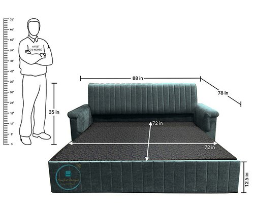 | Product Dimensions : 3 Fold Sofa Cumbed – 88 In (Length) x 34 In (Width) x 35 IN (Height)